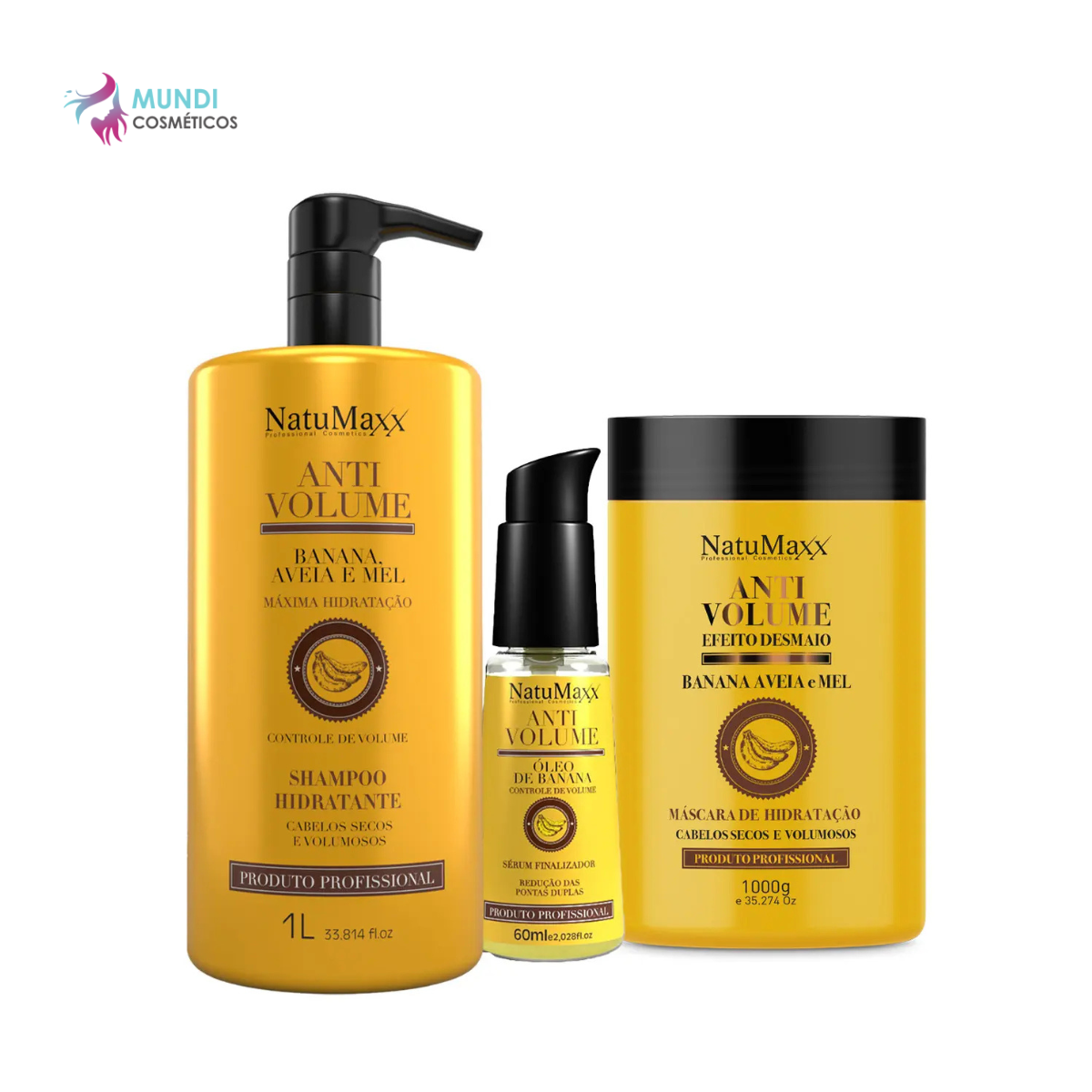 Kit Shampoo 1L + Máscara 1kg + Serum 60ml AntiVolume Banana, Aveia e Mel NatuMaxx